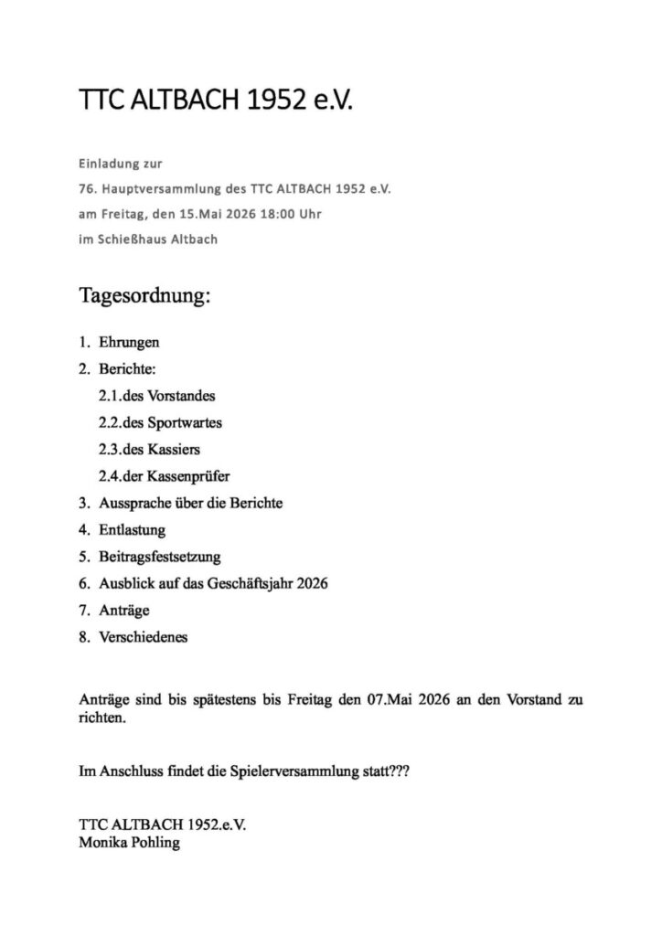 Einladung zur 75. Hauptversammlung des TTC ALTBACH 1952 e.V.